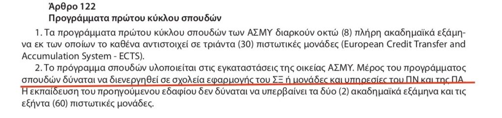 Το άρθρο 122 ορίζει οκτώ (8) εξάμηνα σπουδών, με δυνατότητα τα δύο τελευταία εξάμηνα (60 ECTS) να πραγματοποιούνται: