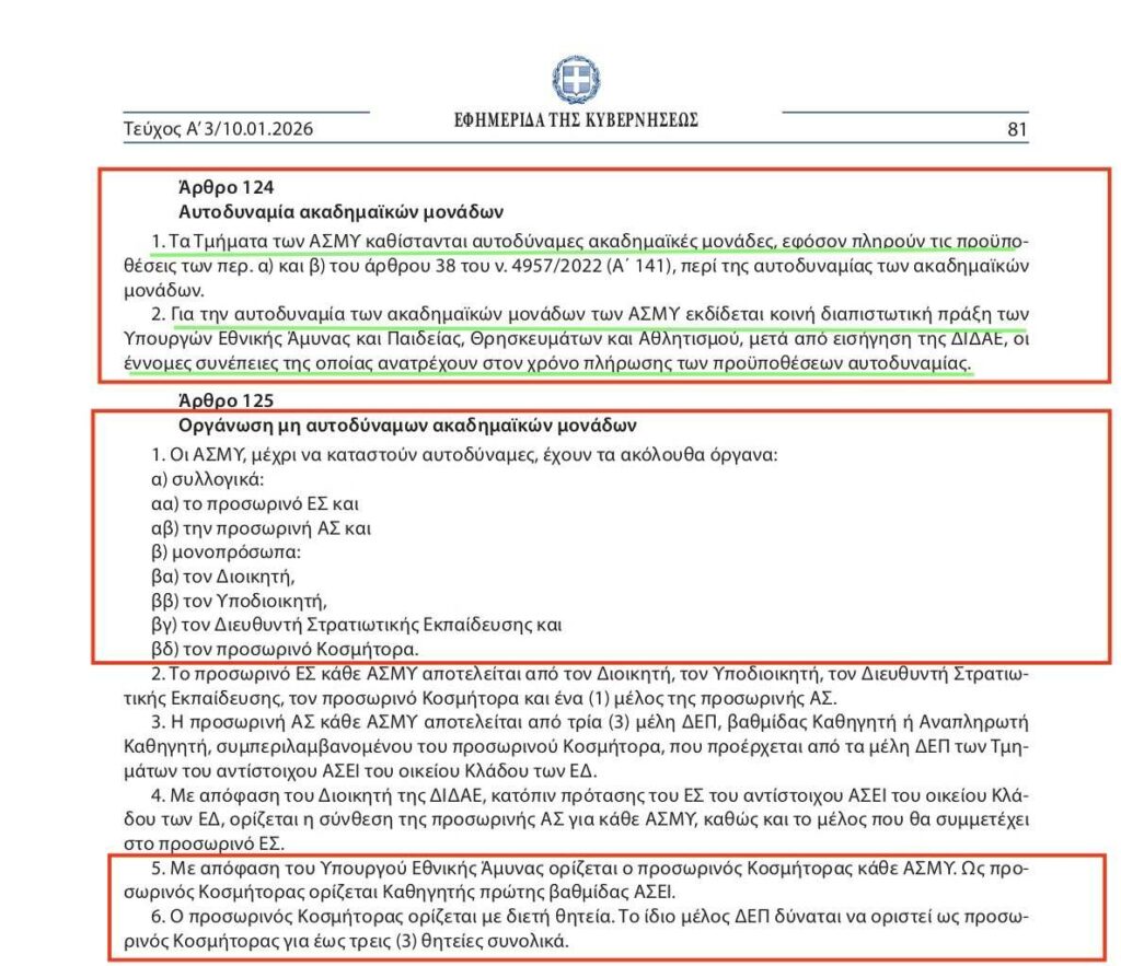 «Για την αυτοδυναμία των ακαδημαϊκών μονάδων των ΑΣΜΥ εκδίδεται κοινή διαπιστωτική πράξη (…) οι έννομες συνέπειες της οποίας ανατρέχουν στον χρόνο πλήρωσης των προϋποθέσεων αυτοδυναμίας.»