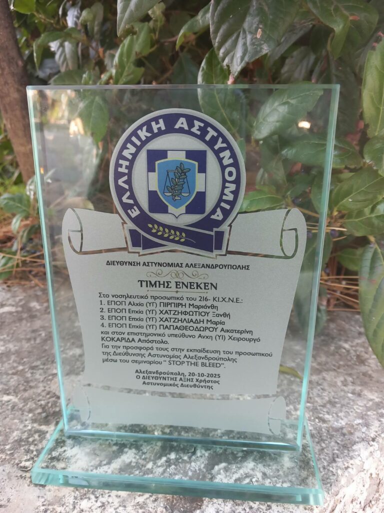 Στις 23 Οκτωβρίου 2025, η Αστυνομική Διεύθυνση Αλεξανδρούπολης τίμησε την εκπαιδευτική ομάδα του 216 ΚΙΧΝΕ της ΑΣΔΙΘ, για την εξαιρετική συνεισφορά της στο πλαίσιο του προγράμματος «STOP THE BLEED».