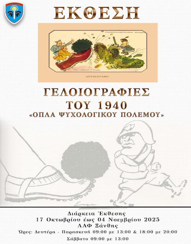 Η ΑΣΔΙΘ, στο πλαίσιο του εορτασμού της Εθνικής Επετείου της «28ης Οκτωβρίου 1940», θα διοργανώσει έκθεση με θέμα «Οι Γελοιογραφίες του 1940: Όπλα Ψυχολογικού Πολέμου», από τη συλλογή του Σχη (ΥΦ) ε.α. Βασίλειου Νικόλτσιου, στη Λέσχη Αξιωματικών Φρουράς Ξάνθης, από την Παρασκευή 17 Οκτ έως και την Τρίτη 04 Νοε 25.