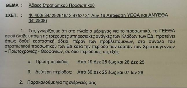 Στο πλαίσιο της μέριμνας για το προσωπικό, το Γενικό Επιτελείο Εθνικής Άμυνας (ΓΕΕΘΑ) προτείνει να χορηγηθεί εορταστική άδεια πέραν των προβλεπομένων στο σύνολο του στρατιωτικού προσωπικού των Ενόπλων Δυνάμεων, κατά την περίοδο των εορτών Χριστουγέννων – Πρωτοχρονιάς – Θεοφανίων.