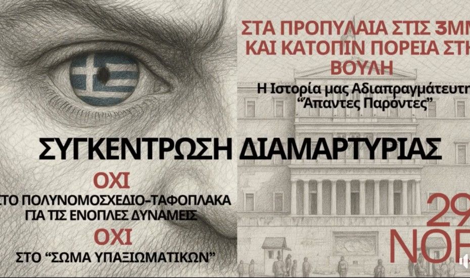 Όλοι στην προγραμματισμένη Συγκέντρωση Διαμαρτυρίας το Σάββατο 29 Νοεμβρίου 2025 και ώρα 15:00 στα Προπύλαια του Πανεπιστημίου Αθηνών, με πορεία στη συνέχεια στη Βουλή των Ελλήνων (Σύνταγμα), στην οποία θα παραβρίσκομαι.