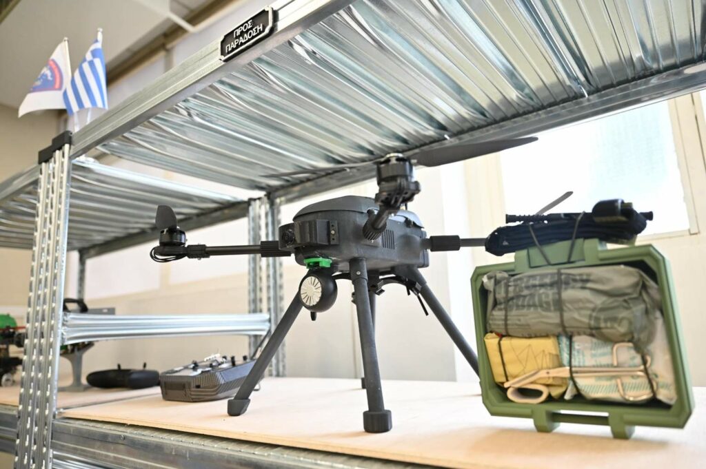 Εδώ έχουμε ένα εργοστάσιο παραγωγής μη επανδρωμένων αεροχημάτων, drones, κατηγορίας Ι και First Person View (FPV), αλλά και μεγαλύτερων drones κατηγορίας Ι, καθώς επίσης εδώ έχουμε αναπτύξει δύο πρωτότυπους φορητούς σταθμούς παραγωγής drones, οι οποίοι θα εμφανιστούν για πρώτη φορά στην παρέλαση της 28ης Οκτωβρίου στη Θεσσαλονίκη. Και είναι κατασκευασμένοι για να ακολουθούν τις μεγάλες μονάδες μας. Δηλαδή, να μπορούν να παράγουν FPV drones επί του πεδίου.
