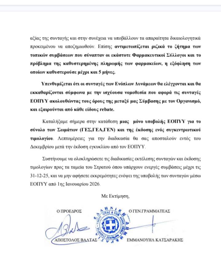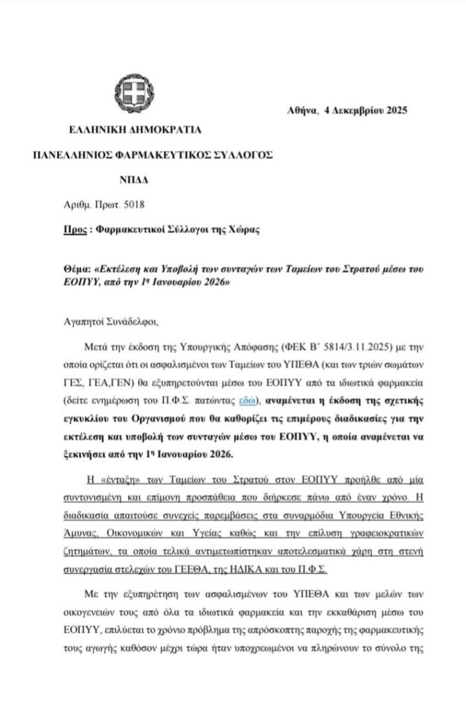 Η Πανελλήνια Ομοσπονδία Ενώσεων Στρατιωτικών – ΠΟΜΕΝΣ, ενημερώνει όλα τα στελέχη των Ενόπλων Δυνάμεων ότι, σύμφωνα με την Υπουργική Απόφαση (ΦΕΚ Β’ 5814/03.11.2025) και την ανακοίνωση του Πανελλήνιου Φαρμακευτικού Συλλόγου, από 1η Ιανουαρίου 2026 οι συνταγές φαρμάκων των ασφαλισμένων του ΥΠΕΘΑ (ΓΕΣ – ΓΕΑ – ΓΕΝ), καθώς και των μελών των οικογενειών τους, θα εκτελούνται πλέον από όλα τα ιδιωτικά φαρμακεία της χώρας μέσω του ΕΟΠΥΥ.