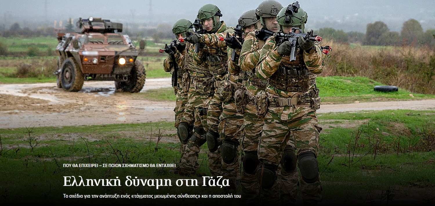 Σε προχωρημένη φάση βρίσκονται οι προετοιμασίες για τη συμμετοχή της Ελλάδας στη Διεθνή Δύναμη Σταθεροποίησης στη Γάζα (International Stabilization Force), κίνηση η οποία κρίνεται απαραίτητη προκειμένου η Αθήνα να δώσει και στο πεδίο σήμα για την απόφασή της να εμπλακεί ενεργά στην επίλυση των κρίσεων στην περιοχή της. Σύμφωνα με άριστα πληροφορημένες πηγές, έχει αποφασιστεί η συμμετοχή με δύναμη επιπέδου τάγματος μειωμένης σύνθεσης, με περίπου 100-150 άνδρες. Αν και αρχικά είχε συμφωνηθεί η ελληνική αποστολή στη Γάζα να είναι αποκλειστικά για υποστήριξη, δηλαδή με στοιχεία του Υγειονομικού Σώματος και του Μηχανικού, τελικώς θα περιλαμβάνονται και δυνάμεις που θα έχουν αποκλειστικό σκοπό την παροχή ασφαλείας. Το τμήμα ασφαλείας, δηλαδή τα μάχιμα τμήματα του ελληνικού στρατού, θα βρεθούν στο Ισραήλ και στη Γάζα προκειμένου να συνοδεύσουν το Υγειονομικό και το Μηχανικό, το οποίο θα συνεισφέρει και με μηχανήματα, προφανώς για τις απαραίτητες εργασίες εντός της Γάζας. Τα μάχιμα τμήματα των Ενόπλων Δυνάμεων θα κινούνται στη Γάζα με τροχοφόρα τεθωρακισμένα οχήματα αναγνώρισης του Στρατού Ξηράς, κατά πάσα πιθανότητα με Μ-1117.