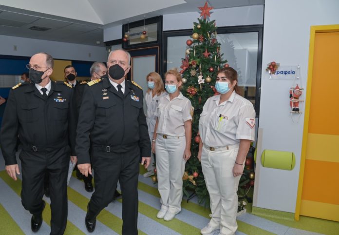 Κατά τη διάρκεια της επίσκεψής του, ο Αρχηγός ΓΕΝ συνοδευόμενος από τον Υπαρχηγό ΓΕΝ Υποναύαρχο Γεώργιο Καμπουράκη ΠΝ, τον Διευθυντή Διεύθυνσης Υγειονομικού του ΓΕΝ Υποναύαρχο (ΥΙ) Αντώνιο Παπαγεωργίου ΠΝ και τον Διευθυντή του ΝΝΑ Αρχιπλοίαρχο (ΥΙ) Λάμπρο Μπιλάλη ΠΝ, αντάλλαξε ευχές με ασθενείς του νοσοκομείου και το ιατρικό και νοσηλευτικό προσωπικό, συγχαίροντάς τους για το σημαντικό έργο που επιτελούν.