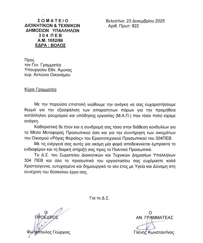 Τις ευχαριστίες του προς τον Γενικό Γραμματέα του Υπουργείου Εθνικής Άμυνας, κ. Αντώνιο Οικονόμου, εκφράζει με επίσημη επιστολή του το Σωματείο Διοικητικών και Τεχνικών Δημοσίων Υπαλλήλων του 304 ΠΕΒ, αναγνωρίζοντας την ουσιαστική και έμπρακτη στήριξή του σε κρίσιμα ζητήματα που αφορούν το προσωπικό.