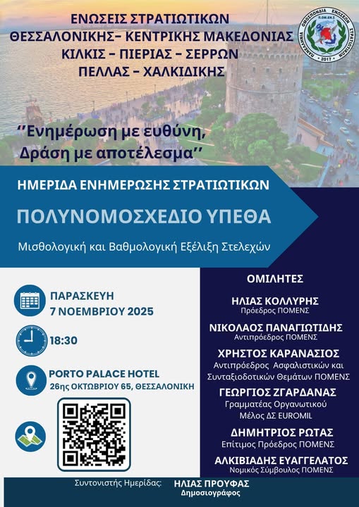 Μια ιδιαίτερα σημαντική Ημερίδα Ενημέρωσης Στρατιωτικών με θέμα το Πολυνομοσχέδιο του Υπουργείου Εθνικής Άμυνας (ΥΠΕΘΑ) διοργανώνουν οι Ενώσεις Στρατιωτικών Θεσσαλονίκης – Κεντρικής Μακεδονίας, Κιλκίς, Πιερίας, Σερρών, Πέλλας και Χαλκιδικής, την Παρασκευή 7 Νοεμβρίου 2025, στις 18:30, στο Porto Palace Hotel (26ης Οκτωβρίου 65, Θεσσαλονίκη).