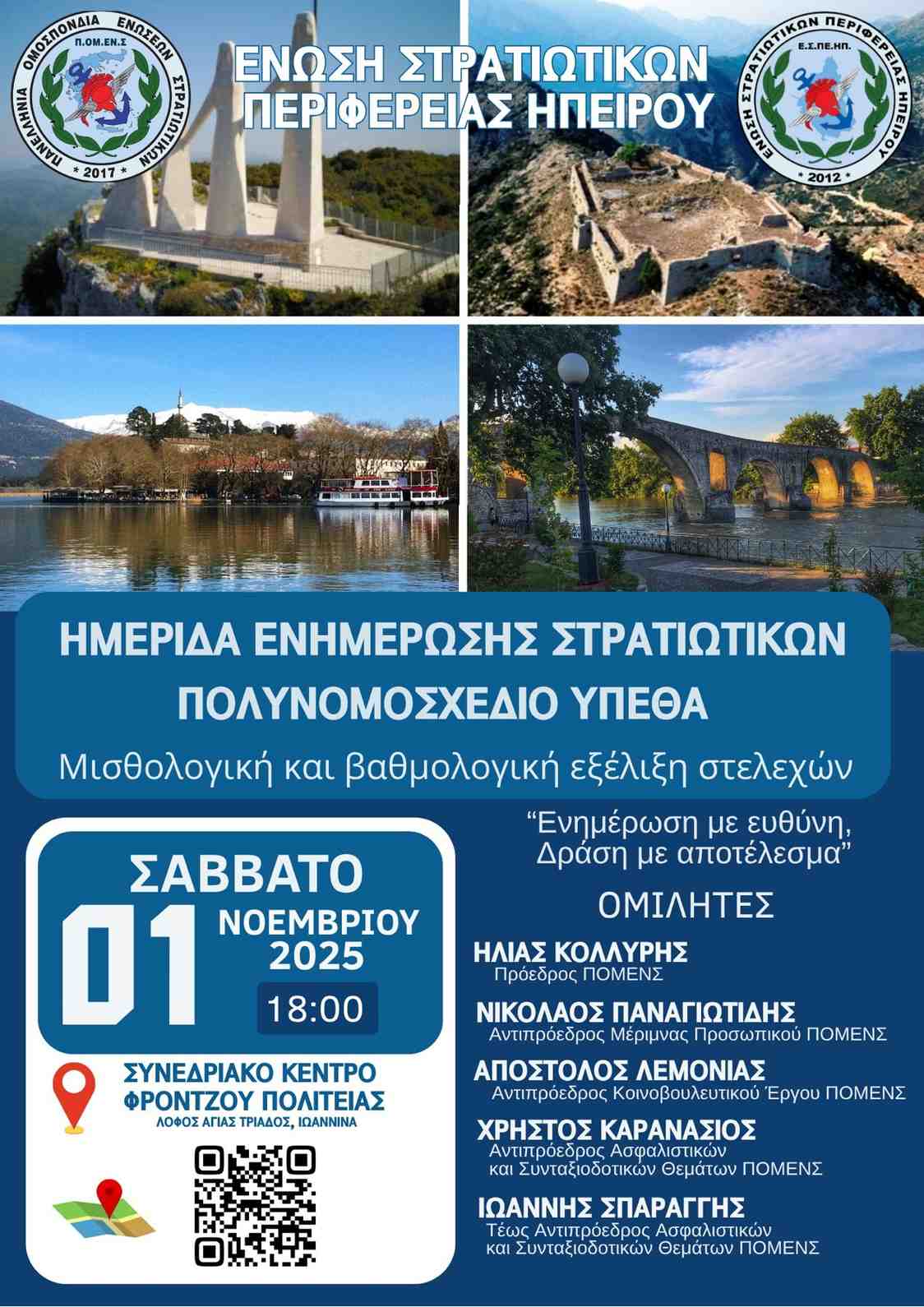 Η Ένωση Στρατιωτικών Περιφέρειας Ηπείρου (Ε.Σ.ΠΕ.ΗΠ.), με τη στήριξη της Πανελλήνιας Ομοσπονδίας Ενώσεων Στρατιωτικών (Π.ΟΜ.ΕΝ.Σ.) και τη συμμετοχή της Ένωσης Στρατιωτικών Περιφερειακής Ενότητας Αιτωλοακαρνανίας (Ε.Σ.ΠΕ.Ε.ΑΙΤ) και της Ένωσης Στρατιωτικών Περιφερειακής Ενότητας Θεσπρωτίας (Ε.Σ.ΠΕ.Ε.Θ.), διοργανώνει Ημερίδα Ενημέρωσης Στρατιωτικών με θέμα: