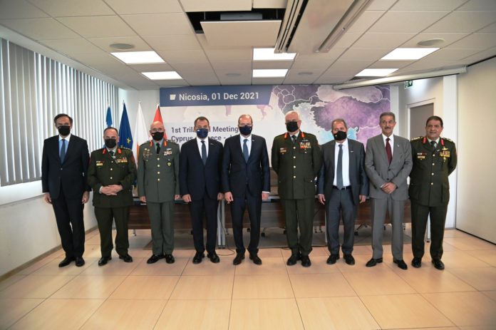 Ο Υπουργός Εθνικής Αμύνης κ. Νικόλαος Παναγιωτόπουλος συμμετείχε σήμερα, Τετάρτη 01 Δεκεμβρίου, στη Λευκωσία, στην 1η Τριμερή Συνάντηση Ελλάδος, Κύπρου και Ιορδανίας, στην οποία συμμετείχαν επίσης ο Κύπριος Υπουργός Αμύνης κ. Χαράλαμπος Πετρίδης και ο Αρχηγός Ενόπλων Δυνάμεων της Ιορδανίας Αντιστράτηγος Γιουσέφ Αχμέτ Χουνεϊτί (Major General Yousef Ahmed Huneiti). Συζητήθηκαν οι τελευταίες εξελίξεις στην περιοχή, καθώς και η πρόοδος της συνεργασίας που έχει επιτευχθεί στον αμυντικό τομέα.