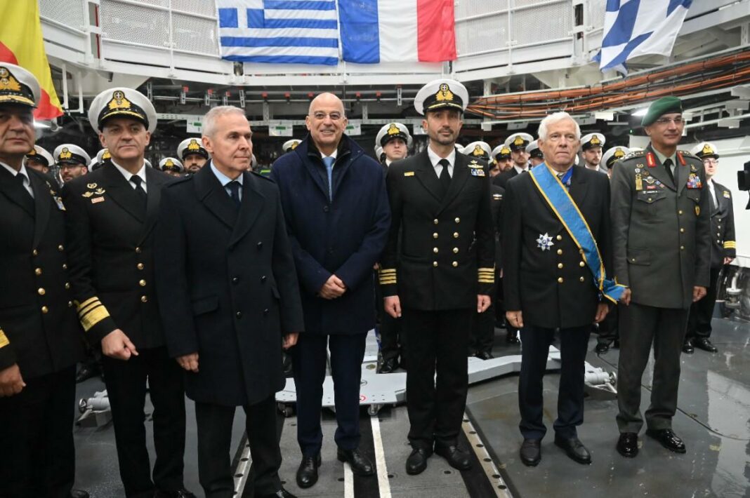 Και οφείλω εδώ να κάνω μια αναφορά στη Στρατηγική μας Σχέση με την Γαλλία. Την χώρα, στην οποία κατασκευάστηκε αυτό το εξαιρετικό πλοίο. Η Συμφωνία Στρατηγικής Εταιρικής Σχέσης της 28ης Σεπτεμβρίου 2021, την οποία υπέγραψα τότε ως Υπουργός Εξωτερικών της Ελληνικής Δημοκρατίας, αποτέλεσε μια στρατηγική επιλογή για τη Πατρίδα μας. Ενσωματώνει και την αλληλεγγύη μεταξύ δύο κρατών.