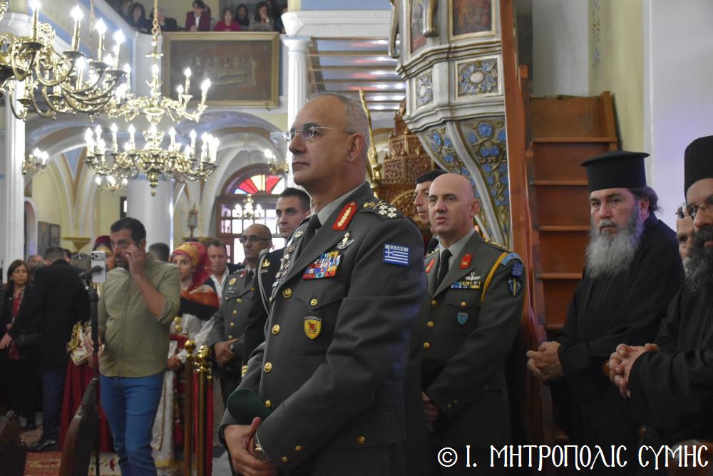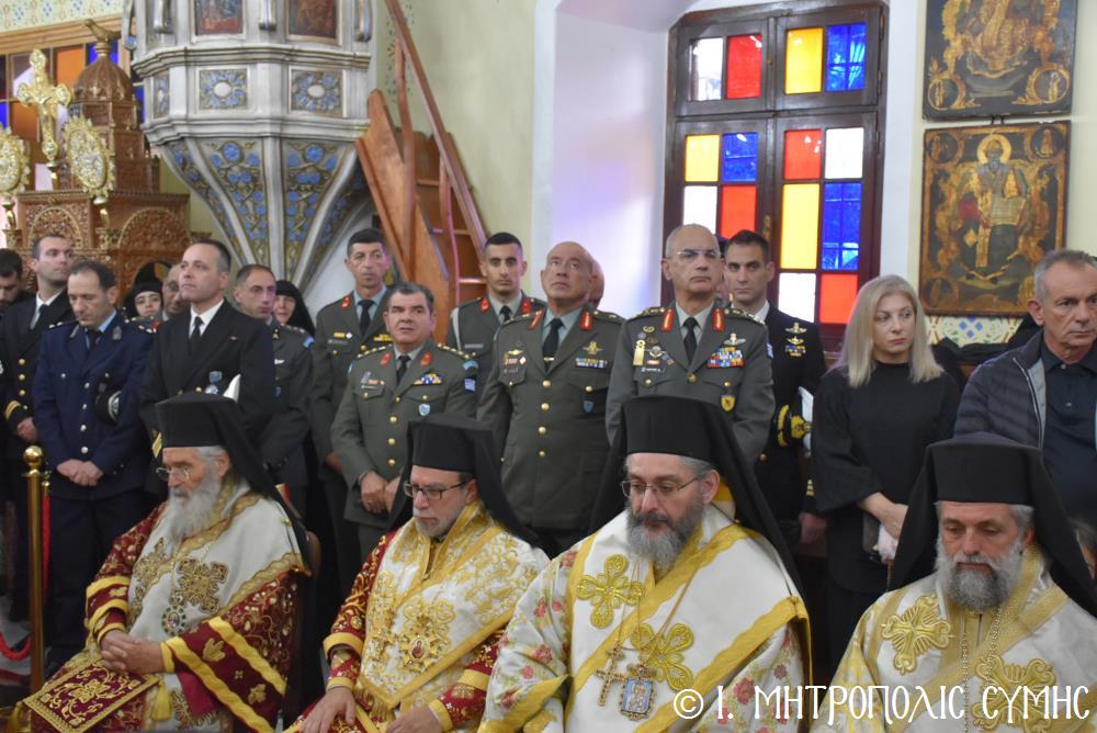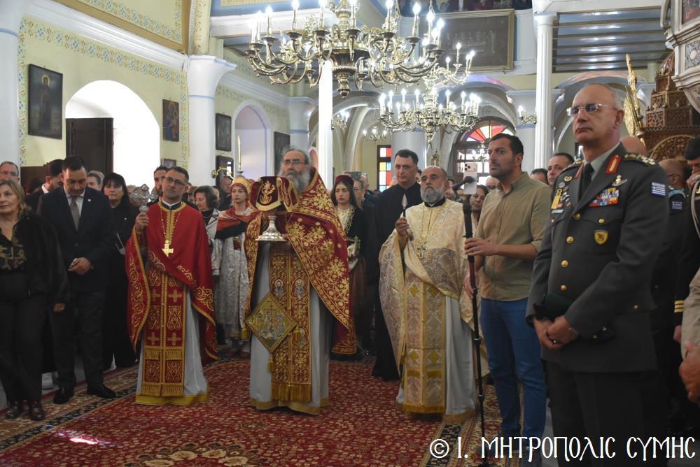 Μεταξύ τοῦ πυκνοῦ ἐκκλησιάσματος, ἦταν ὁ Δήμαρχος, Σύμης κ. Ἐλευθέριος Παπακαλοδούκας Ἀντιδήμαρχοι μετά Μελῶν τοῦ Δημοτικοῦ Συμβουλίιου, ὁ Ἀρχηγός ΓΕΕΘΑ, Στρατηγός κ. Δημήτριος Χούπης, οἱ Ὀφφικιάλιοι τοῦ Οἰκουμενικοῦ Πατριαρχείου καί συνεργάτες τῆς καθ’ καθ’ ἡμᾶς Ἱερᾶς Μητροπόλεως κ. Θεόδωρος Παπαγεωργίου, Ἄρχων Δικαιοφύλαξ καί κ. Θεοδόσιος Κολιάδης, Ἄρχων Μαΐστωρ, ὡς καί ὁ κ. Ἀθανάσιος Στάμος, Ἄρχων Λαοσυνάκτης καί ὁ κ. Ἀθανάσιος Ταβούκτσογλου, Ἄρχων Ρεφενδάριος ἐξ Ἀμερικῆς. Ἐπίσης συμμετεῖχαν ὁ Στρατιωτικός Διοικητής Δ.Α.Ν. Σύμης Συνταγματάρχης κ. Χαράλαμπος Κατηφόρης, ὁ Διοικητής τοῦ 549 Τ.Ε. Σύμης Ἀντισυνταγματάρχης κ. Εὐάγγελος Καρσιώτης, ὁ Ἀστυνομικός Διοικητής Σύμης κ. Δημοσθένης Κοτσιλάρας, ὁ Ὑπολιμενάρχης Σύμης Πλωτάρχης κ. Παράσχος Τσαγκαρέλλης, Ἐκπρόσωποι τῆς ΕΔΟΚ Σύμης, ἡ Πρόεδρος τῆς Ἑνώσεως Γυναικῶν Σύμης κ. Σεβαστή Νικόλη καί ἄλλοι ἐκπρόσωποι τοπικῶν Φορέων καί Συλλόγων, ὡς τῶν Συμαίων τῶν Ἀθηνῶν, τῆς Ρόδου καί τῆς Ἐλευσίνος, καθώς καί Ἐκπρόσωποι Συλλόγων τῶν Χαλκιτῶν Ρόδου καί Ἀθηνῶν. Ἰδιαίτερη δέ ἐντύπωση προκάλεσε ἡ παρουσία κοριτσιῶν τῆς Σύμης καί τῆς Χάλκης, ντυμένα μέ τίς παραδοσιακές ἐνδυμασίες τῶν δύο αὐτῶν νησιῶν μας, πού ἀπηχοῦν τήν μεγάλη ἀπήχηση τοῦ ἐκκλησιαστικοῦ αὐτοῦ γεγονότος στήν συνείδηση τῶν εὐσεβῶν Χριστιανῶν μας.