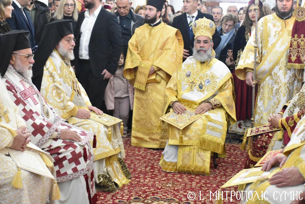 Συλλειτούργησαν ἐπίσης, ἐξ Ἁγίου Ὄρους, ὁ Καθηγούμενος τῆς Ἱερᾶς Μονῆς τῶν Ἰβήρων Ἀρχιμ. π. Ναθαναήλ καί ὁ Ἱερομόναχος Γέρων Νεκτάριος Λαυριώτης, ἐπίσης ὁ Πανοσιολ. Ἀρχιμανδρίτης τοῦ Οἰκουμενικοῦ Θρόνου π. Νικόδημος Σκλέπας, ἡμέτερος ἐν Μεγίστῃ Ἀρχιερατικός Ἐπίτροπος καί ὁ Αἰδεσιμολ. Πρωτοπρεσβύτερος τοῦ Οἰκουμενικοῦ Θρόνου π. Ἐλευθέριος Χρυσοχόος, Γραμματεύς τῆς ἐν Ἀθήναις Ἐκπροσωπήσεως τοῦ Οἰκουμενικοῦ ἡμῶν Πατριαρχείου καί ἐκπρόσωπος τῆς Πατριαρχικῆς Ἐξαρχίας Πάτμου, μετά τῶν Ἱεροδιακόνων π. Ἀμβροσίου, π. Θεοτόκη καί π. Παύλου. Ἡ εὐθύνη τῆς Τάξεως τοῦ Τελετουργικοῦ ἀνετέθη εἰς τόν Ἱερομόναχον Χρυσόστομον, Γέροντα τοῦ ἐν Ἁγίῳ Ὄρει Ἱεροῦ Κελλίου Ἁγίου Ἰωάννου τοῦ Χρυσοστόμου, τά δέ ἱερά ἀναλόγια διηκόνησαν γλυκυφθόγγως χορός Συμαίων Ἱεροψαλτῶν, ὑπό τήν διεύθυνσιν τοῦ Πρωτοψάλτου τοῦ Ἱ. Μητροπολιτικοῦ Ναοῦ κ. Δημοσθένους Γιανναρᾶ, ἐνῶ ἡ συμμετοχή τῶν πιστῶν ὑπῆρξε πάνδημος καί ἐνθουσιώδης. Παρέστησαν συμπροσευχόμενοι, ὁ π. Φιλόθεος καί ὁ π. Χριστόδουλος ἐκ τῆς Ἱ. Μονῆς Κουτλουμουσίου, ὁ Γεν. Ἀρχιερατικός Ἐπίτροπος τῆς Ἱ. Μητροπόλεως Πρωτοπρ. π. Στέφανος Μακρῆς, ὁ Οἰκονόμος π. Σάββας Πατέρας Ἀρχιερατικός Ἐπίτροπος Χάλκης καί ἅπαντες οἱ Ἐφημέριοι τῆς Νήσου μας, μετά τῶν λοιπῶν ἐπισκεπτῶν Ἱερέων, ὡς καί ἡ Ὁσιωτ. ἡγουμένη τῆς Ἱ. Μονῆς Παναγίας Ὑψενῆς Ρόδου Ἀδελφή Μαριάμ.