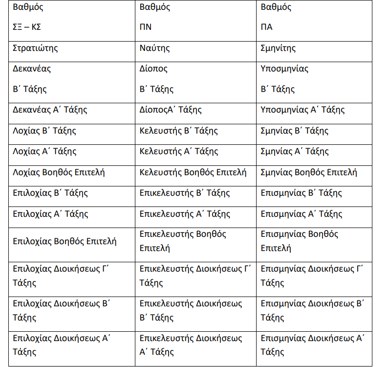 βαθμοί των ΕΠ.ΟΠ. των τριών Κλάδων και των Κοινών Σωμάτων των Ενόπλων Δυνάμεων,
