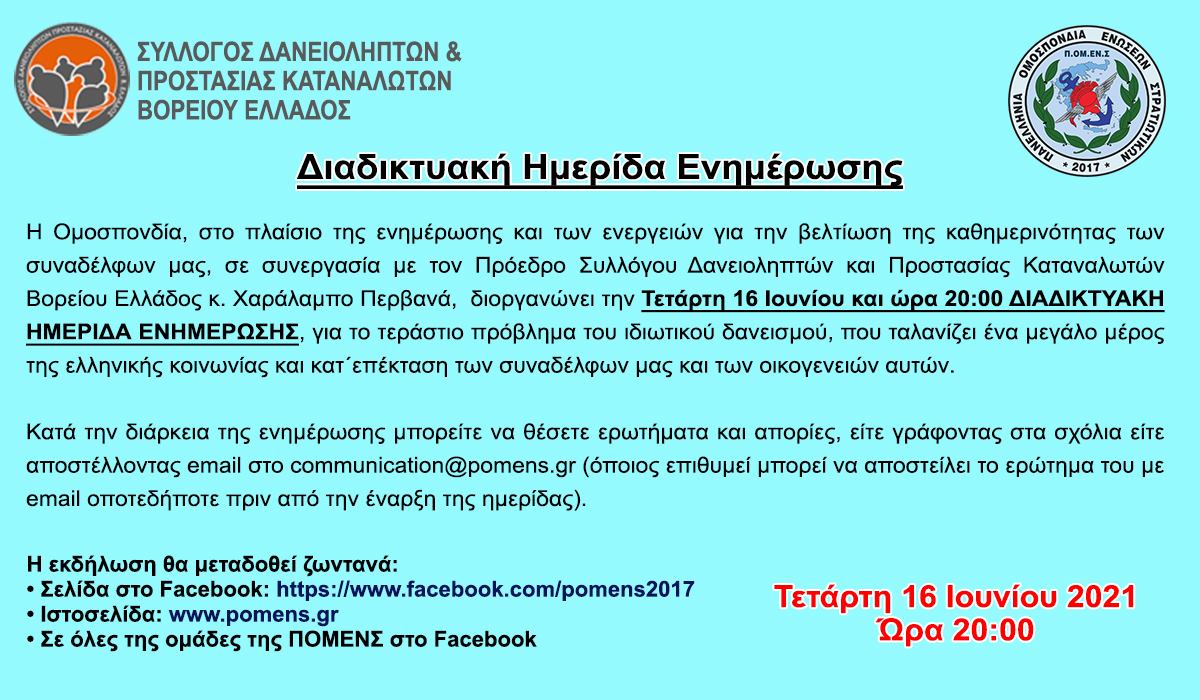 Σε συνεργασία με τον Πρόεδρο Δανειοληπτών και Καταναλωτών Βορείου Ελλάδος, Χαράλαμπο Περβανά, θα πραγματοποιηθεί ζωντανή ενημέρωση – μετάδοση με ταυτόχρονη υποβολή ερωτημάτων.