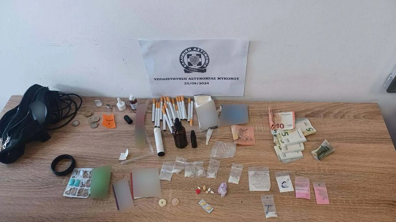 Συγκεκριμένα, βρέθηκαν ποσότητες κρυσταλλικής μεθαμφεταμίνης, κοκαΐνης, ροζ κοκαΐνης, σκόνης MDMA και υδροβουτυρικού οξέως.