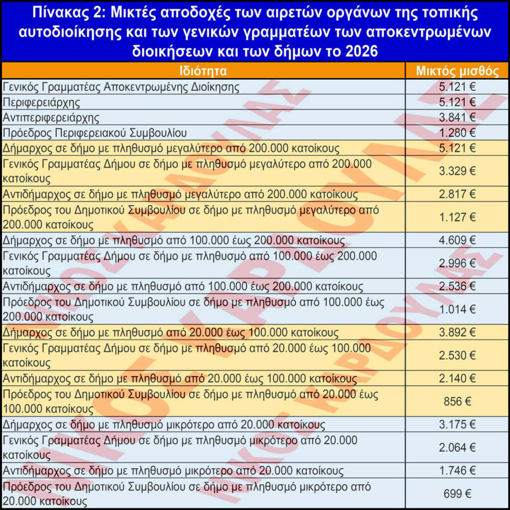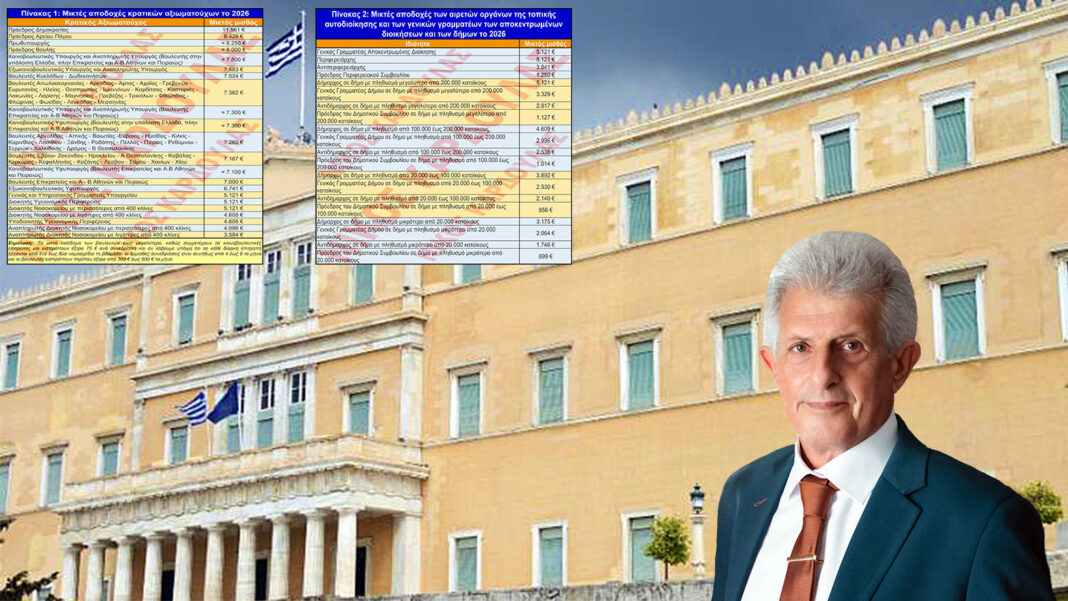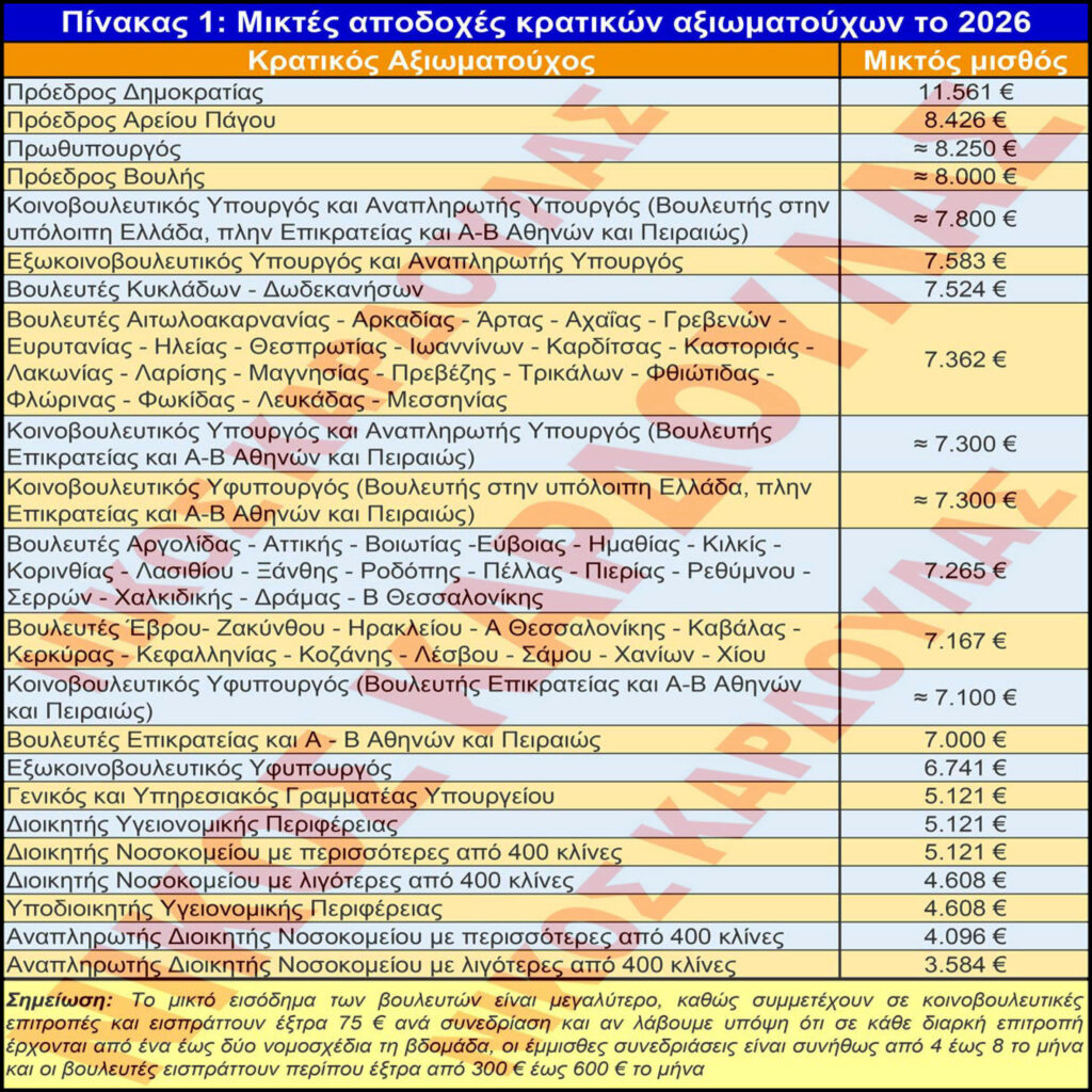 Λαμβάνοντας υπόψη επίσημα στοιχεία από τη Βουλή, από ΦΕΚ και από δημοσιεύσεις στο διαδίκτυο, συντάχθηκαν οι δύο παρακάτω πίνακες, όπου απεικονίζονται στον πίνακα 1 οιμικτές αποδοχές των κρατικών αξιωματούχων και στον πίνακα 2 οι μικτές αποδοχές των αιρετών οργάνων της Τοπικής Αυτοδιοίκησης και των Γενικών Γραμματέων των Αποκεντρωμένων Διοικήσεων και των Δήμων, για το έτος 2026.