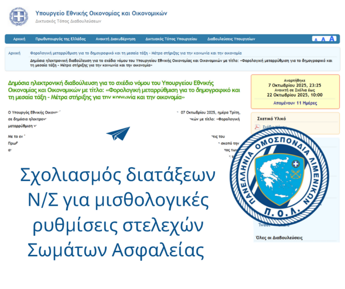 Η Ομοσπονδία μας στο πλαίσιο της δημόσιας ηλεκτρονικής διαβούλευσης για το σχέδιο νόμου του Υπουργείου Εθνικής Οικονομίας και Οικονομικών με τίτλο: «Φορολογική μεταρρύθμιση για το δημογραφικό και τη μεσαία τάξη – Μέτρα στήριξης για την κοινωνία και την οικονομία», το οποίο έχει αναρτηθεί στο ΔΙΑΥΓΕΙΑ από την 7 Οκτωβρίου 2025, υπέβαλε σχόλιο – αίτημα της σχετικά με την τη χορήγηση των ειδικών αποζημιώσεων της νυκτερινής εργασίας και της απασχόλησης πέραν του πενθημέρου και στους μαθητές-δόκιμους των σχολών του Λιμενικού Σώματος- Ελληνικής Ακτοφυλακής.