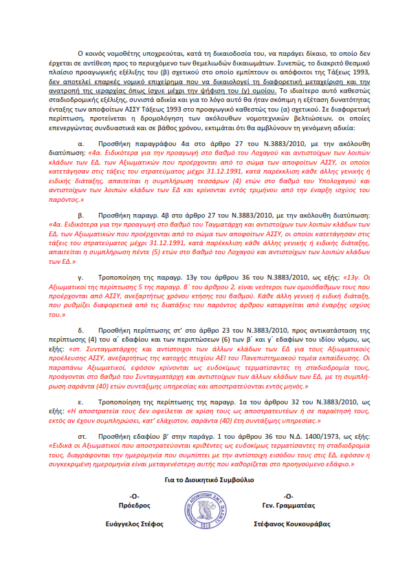 Συνεπώς, το διακριτό θεσμικό πλαίσιο προαγωγικής εξέλιξης του Ν.3883/2010 στο οποίο εμπίπτουν οι απόφοιτοι ΑΣΣΥ της Τάξεως 1993, δεν αποτελεί επαρκές νομικό επιχείρημα που να δικαιολογεί τη διαφορετική μεταχείριση και την ανατροπή της ιεραρχίας όπως ίσχυε μέχρι την ψήφιση του Ν.4407/2016.