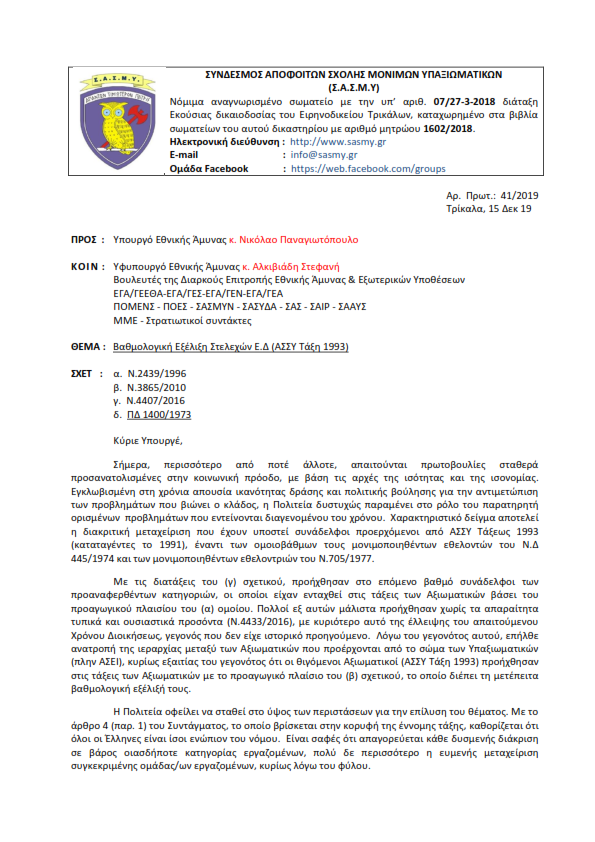 Ο Σύνδεσμος Αποφοίτων Σχολής Μονίμων Υπαξιωματικών (ΣΑΣΜΥ) απέστειλε έγγραφο στον Υπουργό, για την ενημέρωση του, όσον αφορά το ιδιαίτερο αυτό καθεστώς σταδιοδρομικής εξέλιξης των αποφοίτων ΑΣΣΥ 1993, με απώτερο σκοπό την επίλυση του διότι συνιστά αδικία.