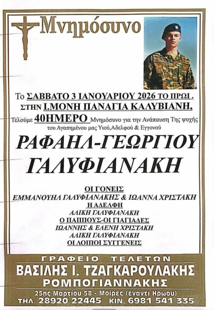 Σαράντα ημέρες μετά την τραγική απώλεια του 19χρονου Επαγγελματία Οπλίτη (ΕΠΟΠ) Ραφαήλ‑Γιώργου Γαλυφιανάκη, η οικογένεια, οι φίλοι και η στρατιωτική κοινότητα ετοιμάζονται να τιμήσουν τη μνήμη του με το 40ήμερο μνημόσυνο που θα τελεστεί το πρωί του Σαββάτου 3 Ιανουαρίου 2026 στην Ιερά Μονή Παναγίας Καλυβιανής στο Τυμπάκι Κρήτης, στη γενέτειρά του.