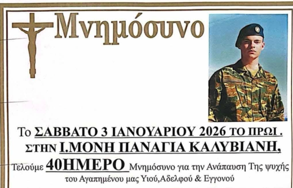 Το μνημόσυνο θα είναι μια στιγμή βαθιάς συγκίνησης και σεβασμού για έναν νέο άνθρωπο που έχασε τη ζωή του εν υπηρεσία, σε μια άσκηση στο πεδίο βολής Αφάντου στη Ρόδο. Η τελετή θα τελεστεί παρουσία συγγενών, φίλων και ανθρώπων που στάθηκαν στο πλευρό της οικογένειας από την πρώτη στιγμή.