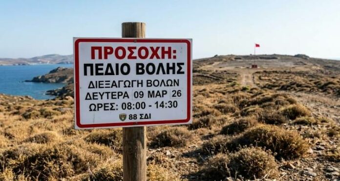 Συγκεκριμένα, την προσεχή Δευτέρα 9 Μαρτίου 2026, στο Πεδίο Βολής «ΠΑΡΑΔΕΙΣΙ», πρόκειται να πραγματοποιηθούν βολές όπλων ευθυτενούς τροχιάς. Οι βολές θα διεξαχθούν από τις 08:00 το πρωί έως και τις 14:30 το μεσημέρι.