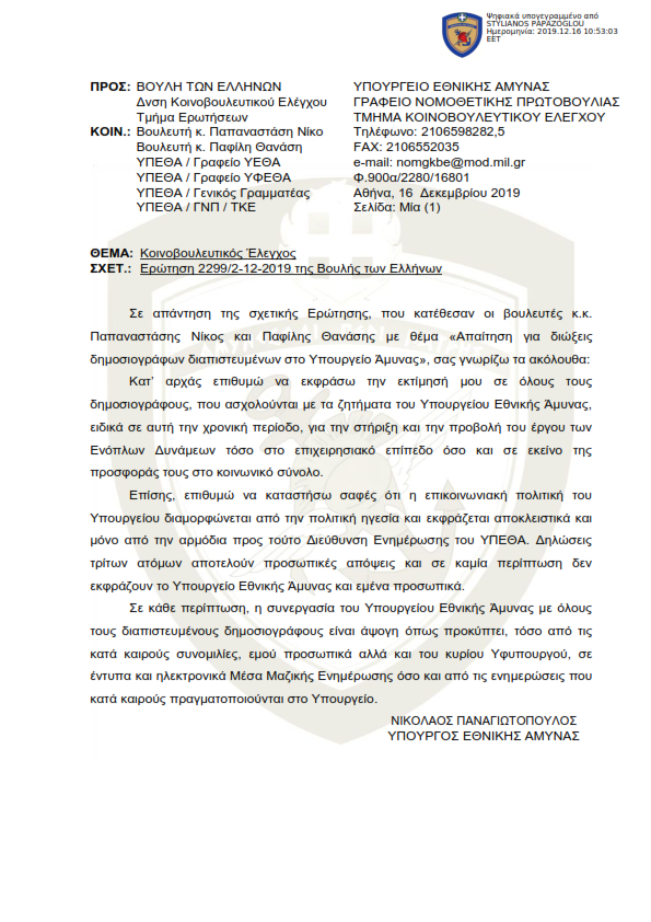 Απαντώντας σε ερώτηση του ΚΚΕ για το θέμα, ο Υπουργός Εθνικής Άμυνας Νίκος Παναγιωτόπουλος, παίρνει για μία ακόμη φορά ξεκάθαρη θέση, λέγοντας χαρακτηριστικά ότι η συνεργασία με όλους τους διαπιστευμένους δημοσιογράφους του ΥΠΕΘΑ, είναι άψογη.