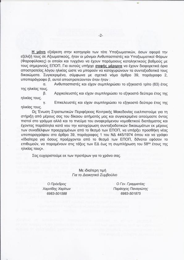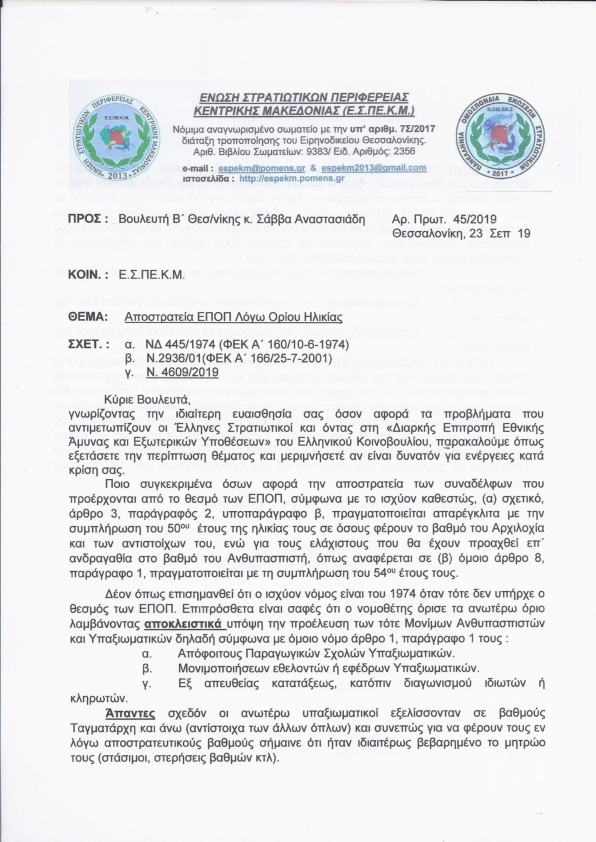 Ο Βουλευτής Β΄ Θεσσαλονίκης της ΝΔ κ. Σάββας Αναστασιάδης, κατόπιν αιτήματος της ΕΣΠΕΚΜ, μαθαίνουμε ότι έχει δρομολογήσει ενέργειες για την αποκατάσταση της αδικίας σε βάρος των προερχόμενων από το θεσμό των ΕΠΟΠ στρατιωτικών αφού με τη συμπλήρωση του 50ου έτους της ηλικίας τους απομακρύνονται από το στράτευμα, παρά τη θέλησή τους, στερώντας τους παράλληλα και συνταξιοδοτικά τους δικαιώματα. Η ΕΣΠΕΚΜ ζητά τη στήριξη όλων των εμπλεκομένων στο δίκαιο αίτημα των συναδέλφων τους. Ακολουθεί η επιστολή της ΕΣΠΕΚΜ προς τον βουλευτή κ. Αναστασιάδη.
