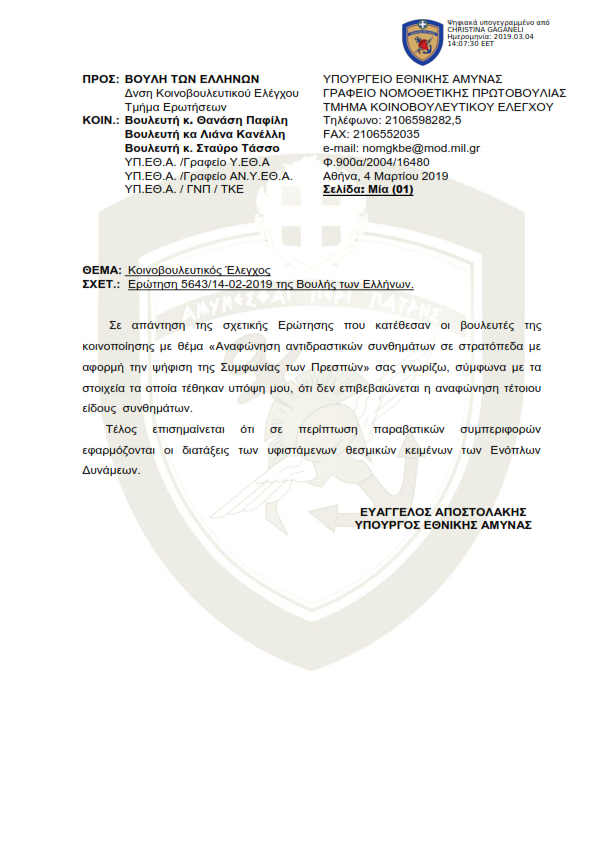 Απάντηση ΥΕΘΑ Ευάγγελου Αποστολάκη σε ερώτηση Κοινοβουλευτικού Ελέγχου (υπ. Αριθμ. 5643/14-02-2019) με θέμα: «Αναφώνηση αντιδραστικών συνθημάτων σε στρατόπεδα με αφορμή την ψήφιση της Συμφωνίας των Πρεσπών»
