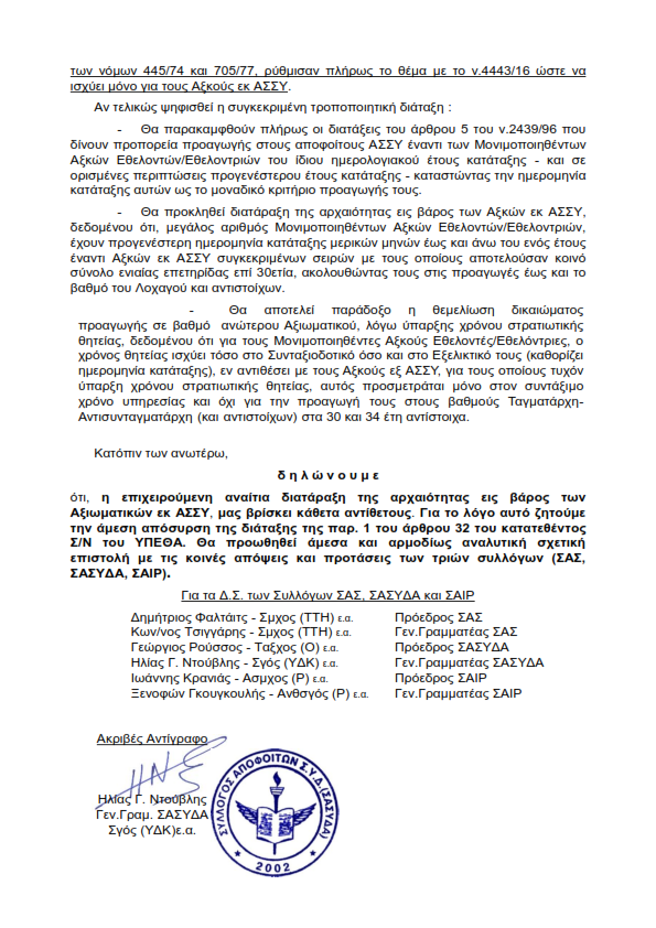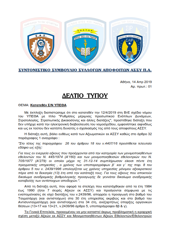 ΚΟΙΝΟ ΔΕΛΤΙΟ ΤΥΠΟΥ των Συλλόγων αποφοίτων ΑΣΣΥ της ΠΑ το Σ/Ν του ΥΠΕΘΑ με τίτλο “Ρυθμίσεις μέριμνας προσωπικού Ενόπλων Δυνάμεων, Στρατολογίας, Στρατιωτικής Δικαιοσύνης και άλλες διατάξεις” που κατατέθηκε για ψήφιση στη ΒτΕ την 12η Απρ. 2019.