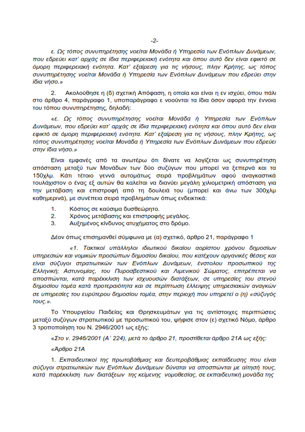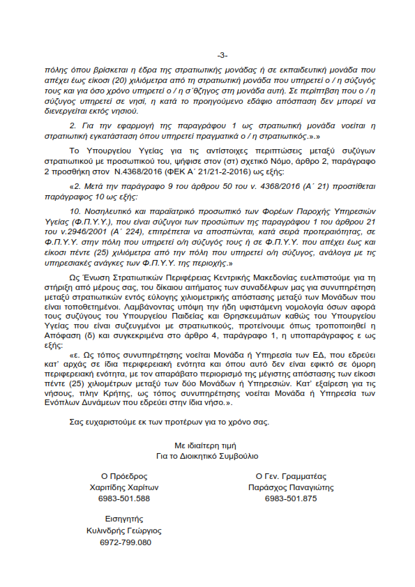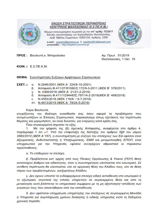Ο Βουλευτής Πιερίας της ΝΔ κ. Ξενοφών Μπαραλιάκος, κατόπιν αιτήματος της ΕΣΠΕΚΜ, έχει δρομολογήσει ενέργειες για την “Συνυπηρέτηση Συζύγων Αμφότερων Στρατιωτικών”. Η ΕΣΠΕΚΜ ζητά τη στήριξη όλων των εμπλεκομένων στο δίκαιο αίτημα των συναδέλφων τους. Ακολουθεί η επιστολή προς τον βουλευτή κ. Μπαραλιάκο η οποία και μας παραχωρήθηκε από την Ένωση.