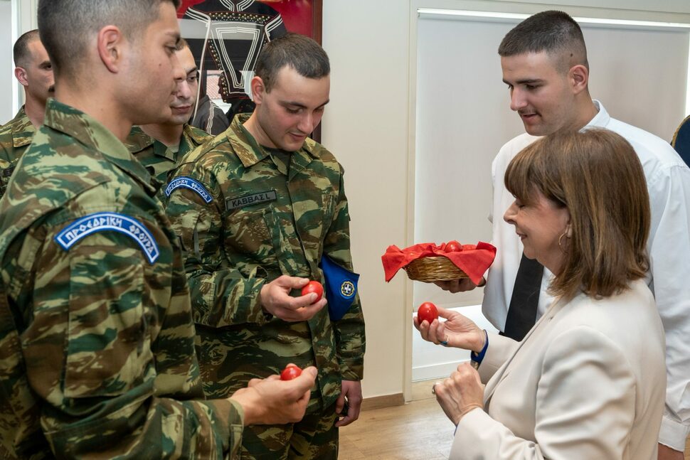 Η Πρόεδρος της Δημοκρατίας Κατερίνα Σακελλαροπούλου μετέβη σήμερα το μεσημέρι στην Προεδρική Φρουρά και αντάλλαξε ευχές για το Πάσχα με τους Εύζωνες και τα στελέχη του στρατοπέδου.