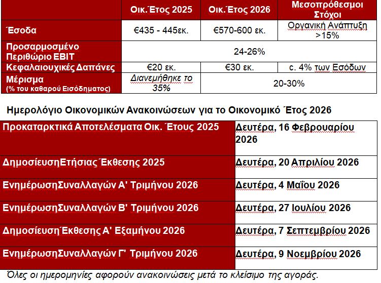 Με την εταιρία να βρίσκεται σε τροχιά επίτευξης ιστορικών εσόδων και κερδών για το Οικονομικό Έτος 2025 και με ευνοϊκές συνθήκες δυναμικής στην αγορά, εισερχόμαστε στο 2026 με ισχυρή ώθηση και δεν αναμένουμε σημάδια επιβράδυνσης στο άμεσο μέλλον.