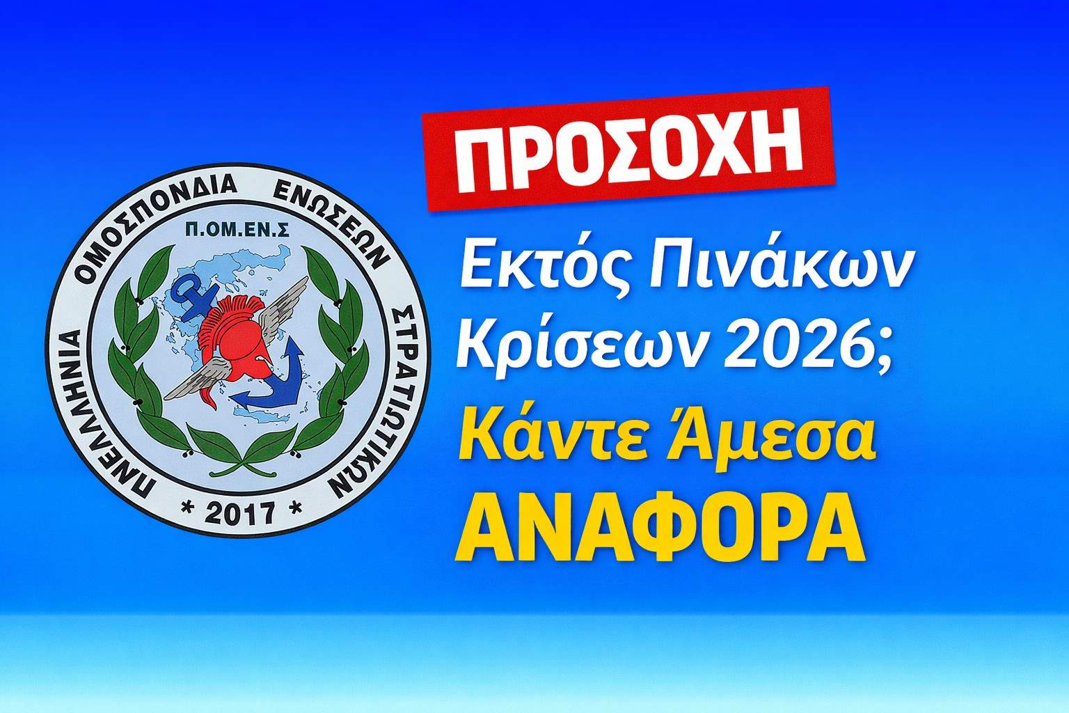 Η Πανελλήνια Ομοσπονδία Ενώσεων Στρατιωτικών – ΠΟΜΕΝΣ στο πλαίσιο της θεσμικής και νομικής διεκδίκησης που έχει αναλάβει για την προσβολή του νέου βαθμολογικού πλαισίου, ενημερώνει ότι οι συνάδελφοι οι οποίοι δεν συμπεριλαμβάνονται στους πίνακες κρίσεων έτους 2026, να υποβάλουν άμεσα σχετική υπηρεσιακή αναφορά, όπως φαίνονται στα υποδείγματα ανάλογα με την προέλευσή τους.