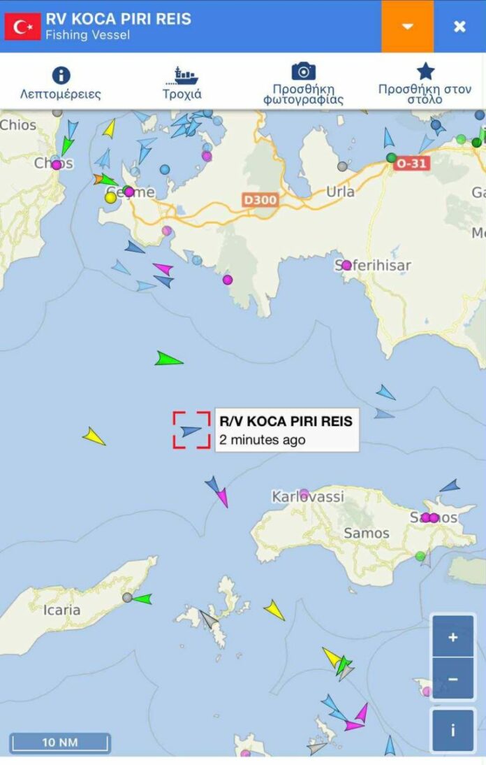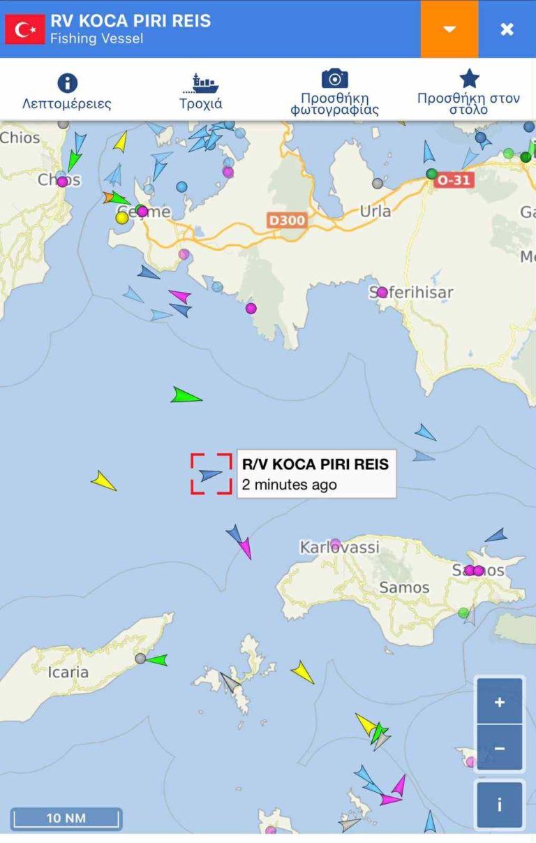 Το τουρκικό ερευνητικό σκάφος «Piri Reis» πλέει μεταξύ Χίου και Σάμου σε διεθνή ύδατα εντός της ελληνικής υφαλοκρηπίδας, όπως προβλέπεται από την παράνομη τουρκική NAVTEX που είχε εκδώσει η υδρογραφική υπηρεσία Σμύρνης, του τουρκικού Πολεμικού Ναυτικού.